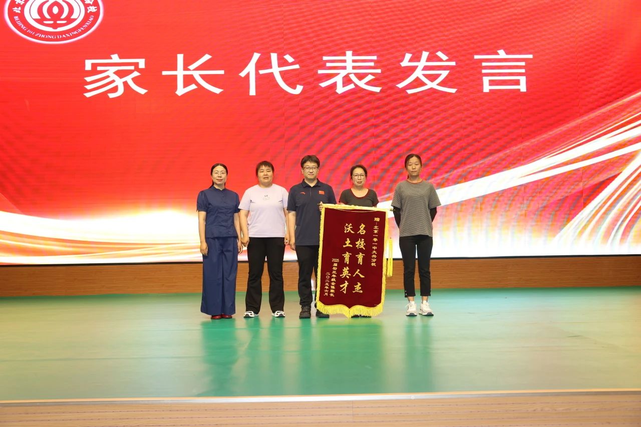家長代表周鵬飛媽媽的發(fā)言真摯感人,字里行間滿溢對學校精心培育的誠摯謝意與對孩子茁壯成長的欣慰自豪。她代表全體家長向學校及年級組以及年級教師表示感謝,并由家長代表分別敬獻了飽含深情的錦旗——“名校育人杰 沃土育英才”贈予學校,“三載栽培恩似海,一生銘記情如山”贈予初三年級,鮮紅的錦旗承載著家長們的最高認可與深切祝福。