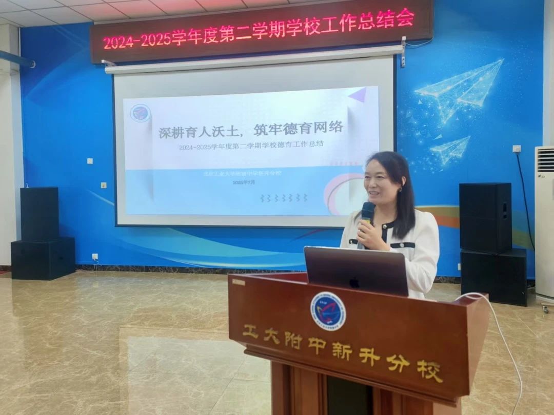 歲月如歌,步履鏗鏘。承載著全體師生的辛勤耕耘與累累碩果,2024-2025學年度第二學期學校各項工作已圓滿收官。2025年7月3日,工大附中新升分校召開了本學期全校工作總結(jié)會,本次會議由大隊輔導(dǎo)員鄭碧瑩老師主持。大會以“立德樹人為根本,改革創(chuàng)新為動力,建設(shè)宜學新升,促進學校發(fā)展”為主題,通過六大篇章系統(tǒng)梳理了黨建引領(lǐng)、德育發(fā)展、教學改革等重點工作,為新學期高質(zhì)量發(fā)展錨定方向、凝聚力量。