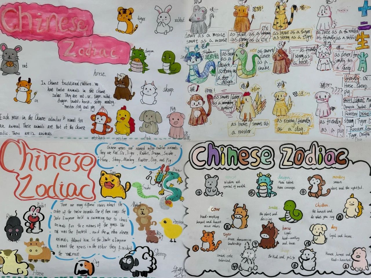 六年級孩子們結(jié)合 “十二生肖與新年”“假期生活與出游” 展開創(chuàng)意創(chuàng)作。他們用彩筆繪制對新年和假期生活的憧憬。紙張上,精美的繪畫、五彩的線條和工整英文書寫相互映襯,巧妙融入英語知識,單詞、短語、小短文生動呈現(xiàn),讓英語學(xué)習(xí)趣味盎然。