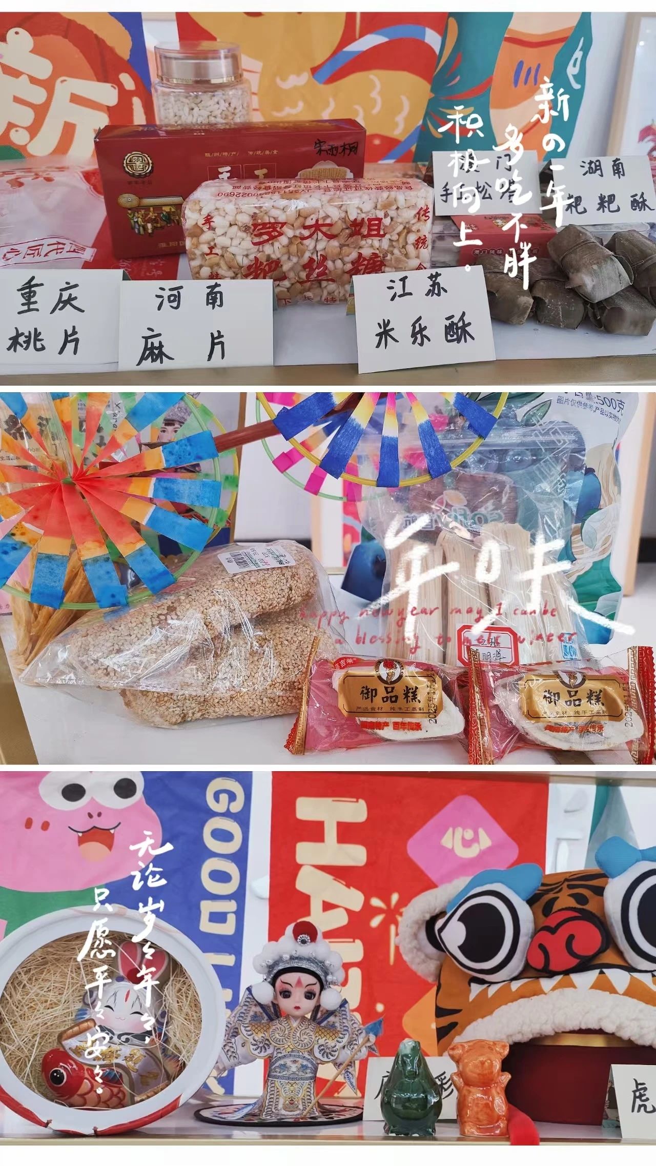 活動(dòng)當(dāng)日,校園又充滿了年味兒,同學(xué)們紛紛化身 “年味推介官”,帶來(lái)家鄉(xiāng)的特色好物。來(lái)自河北的同學(xué)手持精巧的窗花,生肖花鳥(niǎo)躍然紙上;南方水鄉(xiāng)的同學(xué)則捧出家鄉(xiāng)特制的臘味,色澤紅亮、香氣四溢;來(lái)自山東的大煎餅透著豪爽;天津楊柳青年畫(huà)喜氣迎門(mén)……
