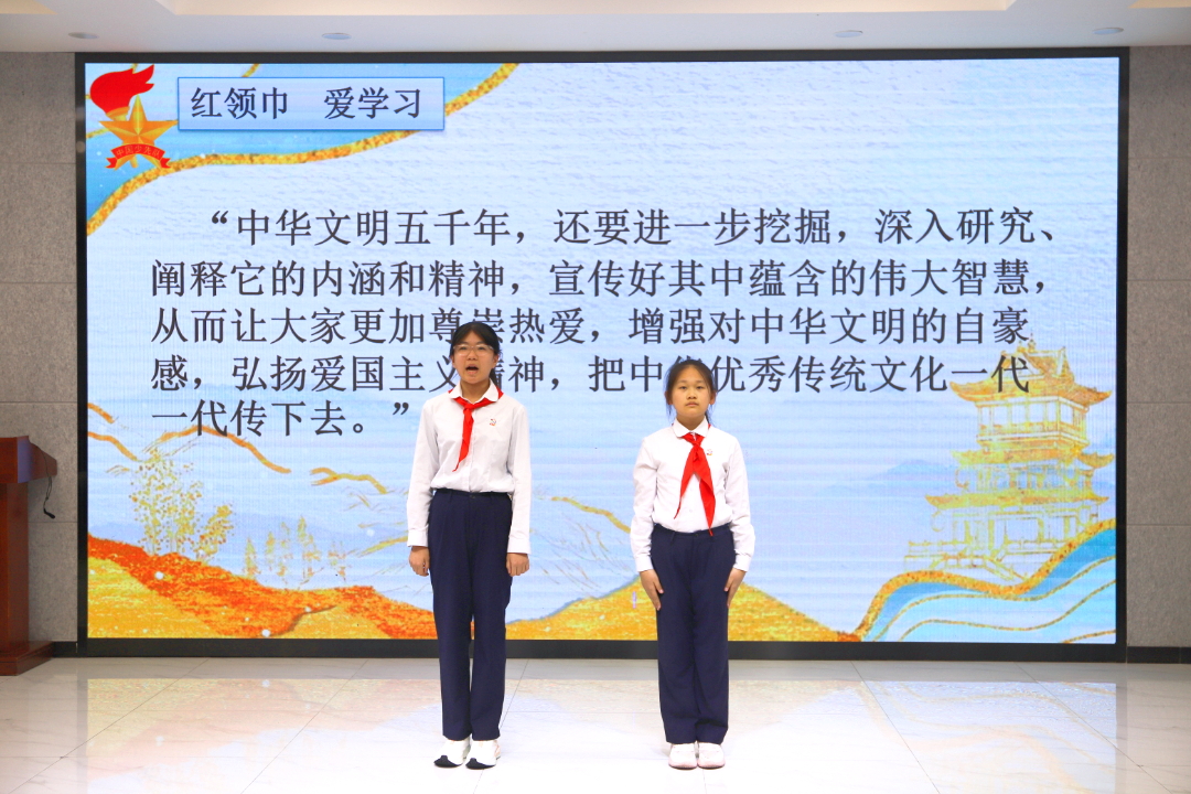 隊(duì)員袁京琳、張了凡帶領(lǐng)隊(duì)員重溫了習(xí)近平總書記的重要講話:中華文明五千年,宣傳好其中蘊(yùn)含的偉大智慧,增強(qiáng)對(duì)中華文明的自豪感,弘揚(yáng)愛國主義精神,把中華優(yōu)秀傳統(tǒng)文化一代一代傳下去。